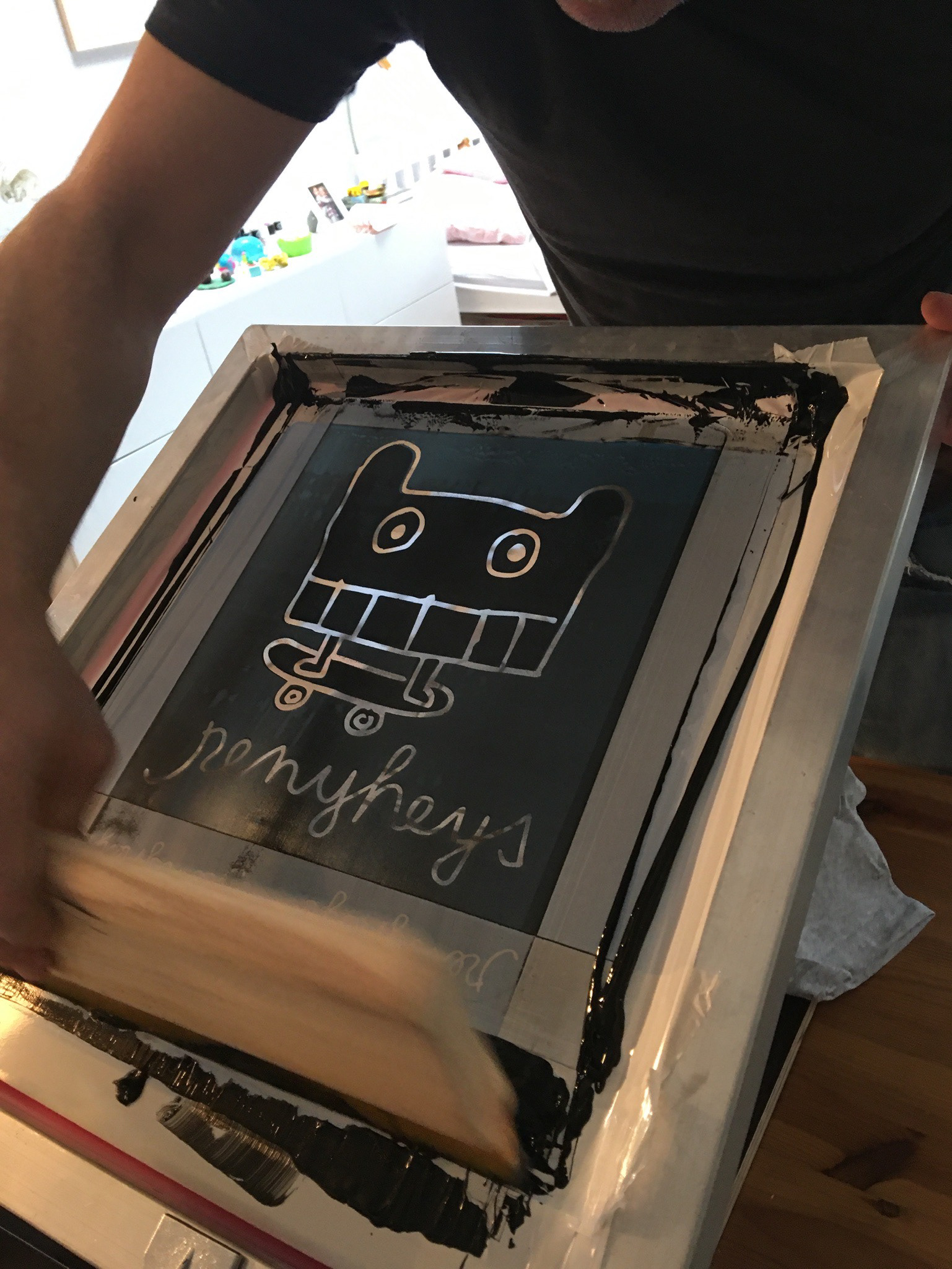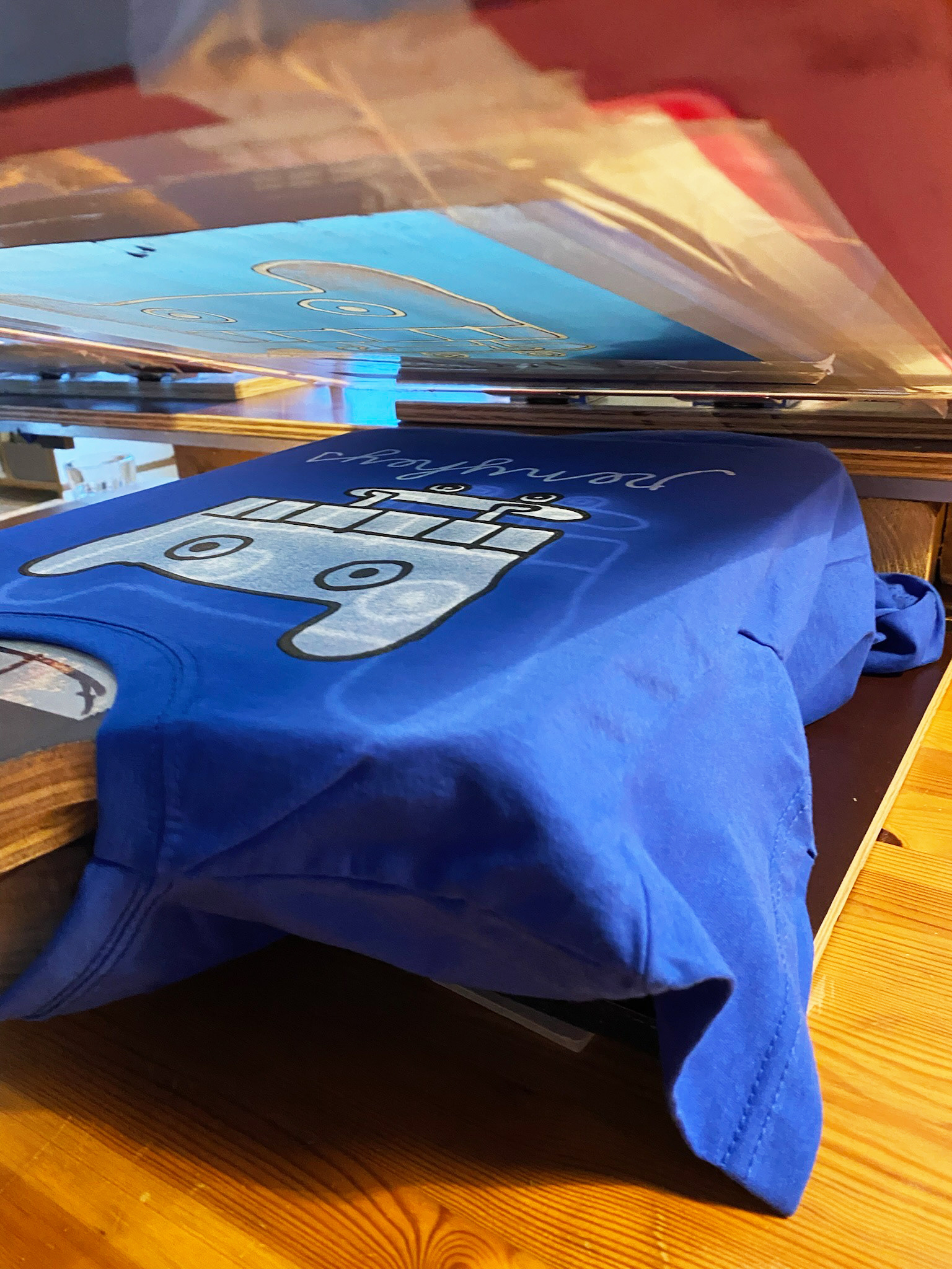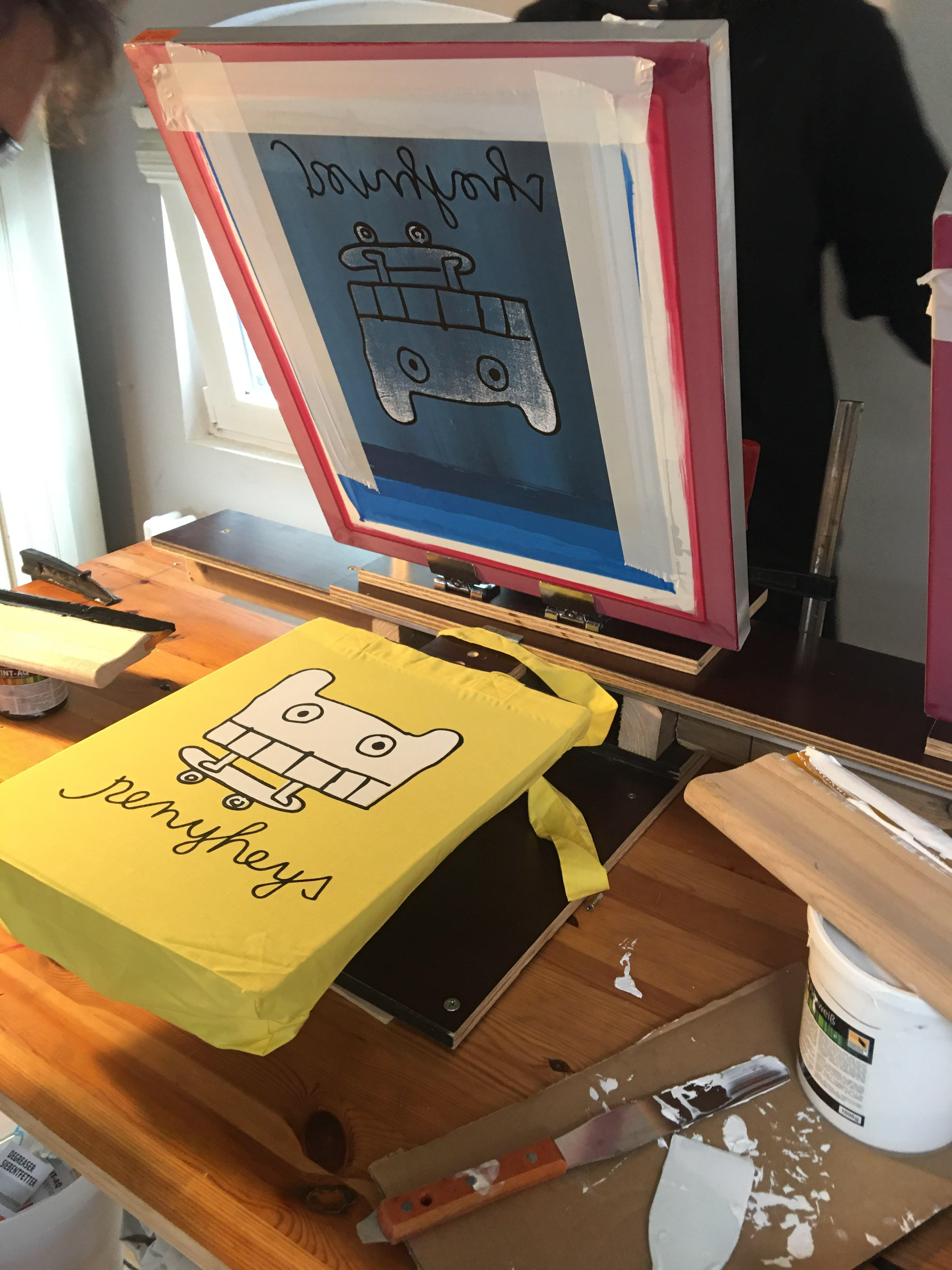 Wir drucken alle unsere Sachen selber. Dafür haben wir uns extra eine kleine Werkstatt eingerichtet. Meistens klappt es sogar ganz gut.