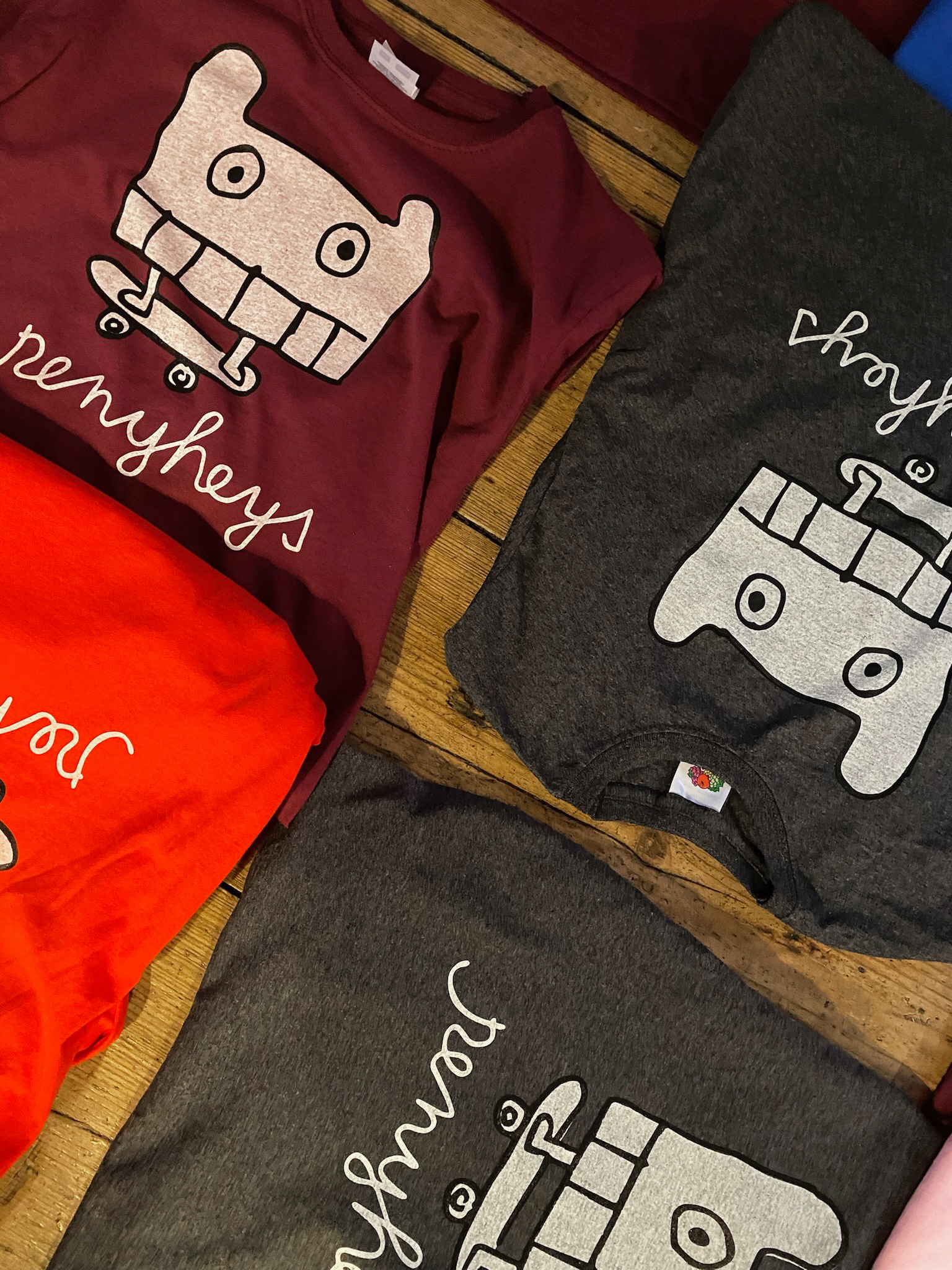 Unsere T-Shirts drucken wir alle selber. Das ist gar nicht so einfach, weil immer irgendwas nicht so richtig klappt. Das Gute - es wird besser je öfter wir das machen. Und das Beste - bald gibt‘s die auch zu kaufen. Irgendwo.
